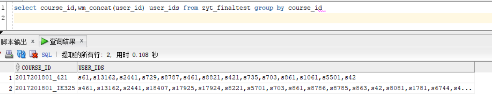 select course_id,wm_concat(user_id) user_ids from zyt_finaltest group by course_id